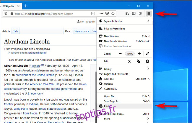 Si vous utilisez Firefox sur un Mac, accédez à la page que vous souhaitez enregistrer au format PDF. Une fois sur place, cliquez sur l’icône du hamburger (trois lignes horizontales) dans le coin supérieur droit et sélectionnez « Imprimer » dans le menu qui apparaît.